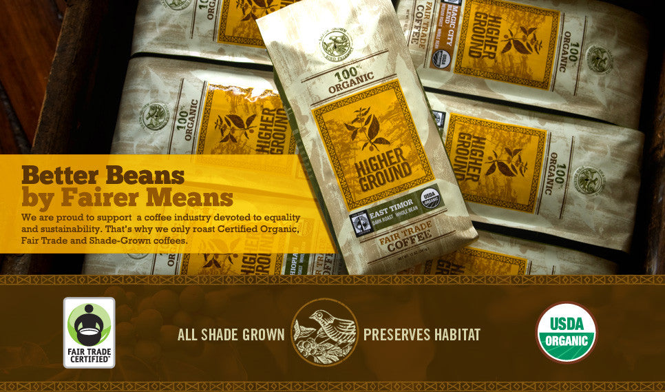 Higher Ground was born through the combination of a desire to produce the highest quality coffee and the hope of improving the act of doing business in today’s world. We purchase and roast exclusively 100% Certified Organic, Fair Trade, and Shade Grown Coffee. We began with three main goals: